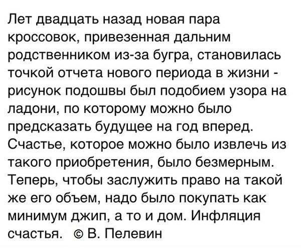 Но вот в данному случае это не инфляция счастья, это проблема взросления. В любом обществе. Инфляция ценностей. В 2 годика ты счастлив оттого, что покакал на горшок, а не в постель. В 92, увы, тоже. А в промежутке между этими датами, годам к 45 тебе нужно для счастья "примерно всё". Просто у каждого представление об этом "всём" совершенно разное.